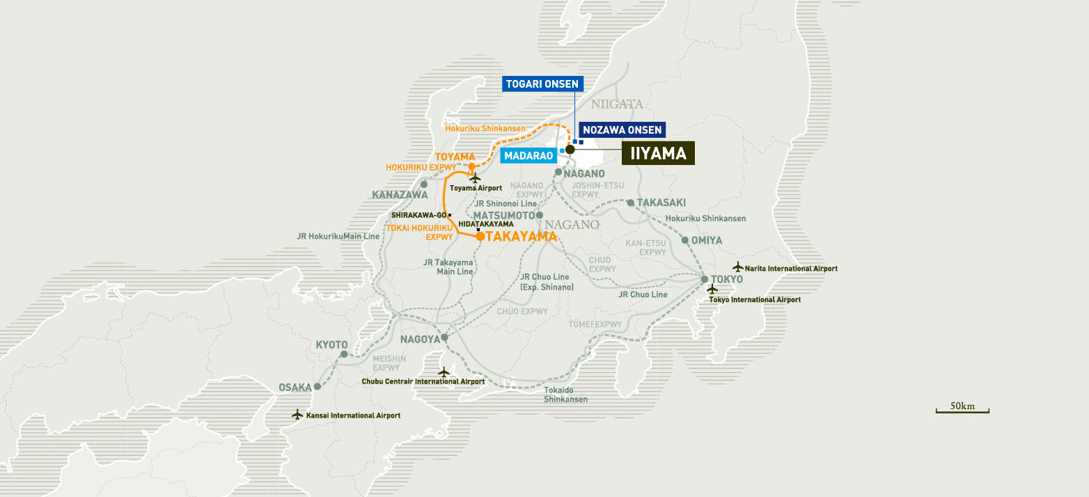 Old streets with a distinct atmosphere, local gourmet foods, and Shirakawa-go, a World Heritage Site.